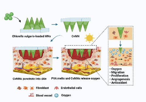 Zhao E, Xiao T, Tan Y, Zhou X, Li Y, Wang X, Zhang K, Ou C, Zhang J, Li Z, Liu H. Separable Microneedles with Photosynthesis-Driven Oxygen Manufactory for Diabetic Wound Healing. ACS Appl Mater Interfaces. 2023 Feb 15;15(6):7725-7734. doi: 10.1021/acsami.2c18809. Epub 2023 Feb 2.