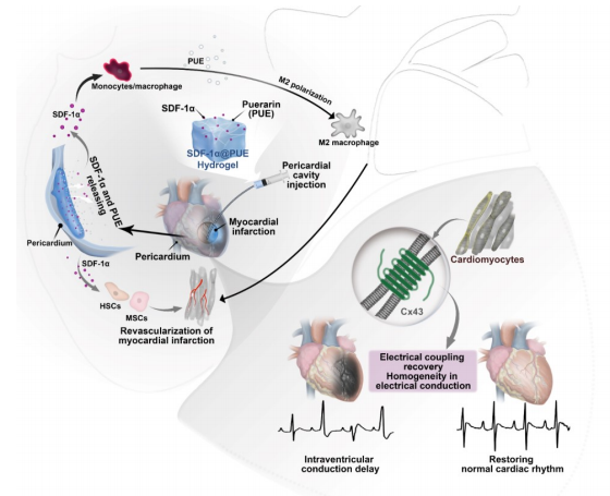 Luo L, Li Y, Bao Z, Zhu D, Chen G, Li W, Xiao Y, Wang Z, Zhang Y, Liu H, Chen Y, Liao Y, Cheng K, Li Z. Pericardial Delivery of SDF-1 α Puerarin Hydrogel Promotes Heart Repair and Electrical Coupling. Adv Mater. 2023 Sep 4:e2302686. doi: 10.1002/adma.202302686.